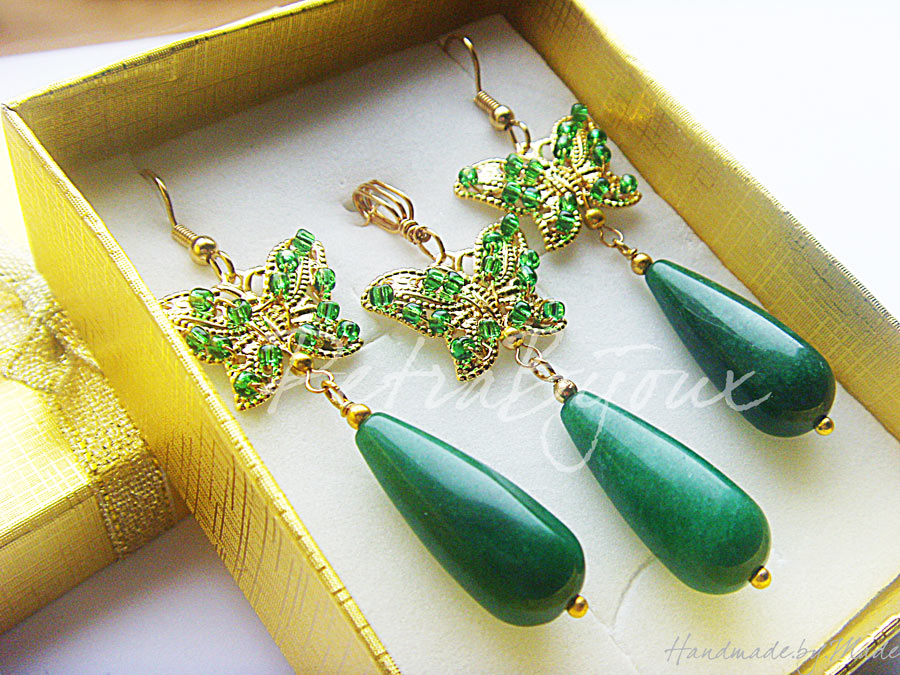 La cerceii-fluture verzi de data trecuta am adaugat un pandantiv. Materiale: elemente decorative placate cu aur, sarma placata aur, tortite placate aur, 'picaturi' din mountain jade verde intens, seedbeads verzi asortate.